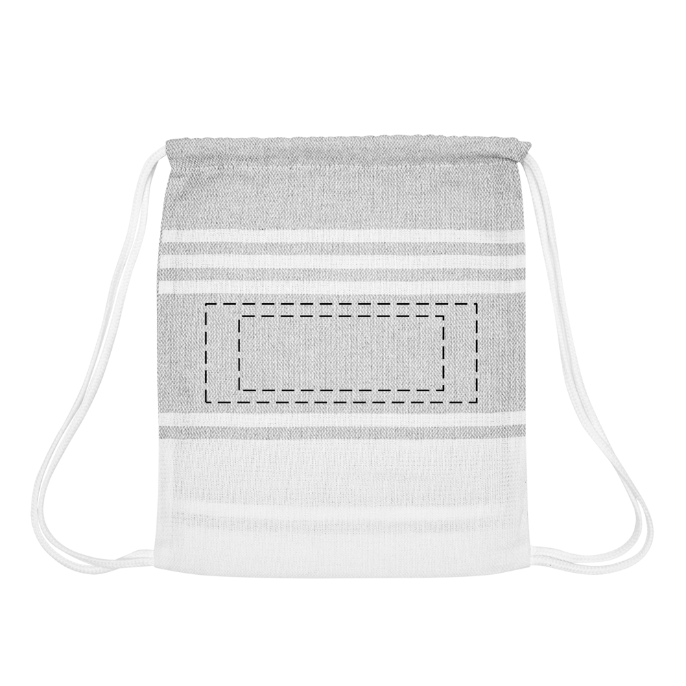 Groot strandlaken/sauna handdoek SUN & STEAM: grote handdoek met witte strepen en franjes, in een bijpassende gekleurde tas met trekkoord.